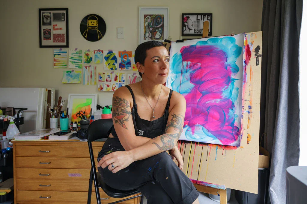 Angela creates vibrant paintings characterised by bold, saturated colours and dynamic gestures. Inspired by feminist musings, Angela is passionate about using art as a means to inspire discussion. Works on paper in a variety of sizes will be available to view and purchase, as well as printed reproductions. You can expect to see demonstration of your practice, view of works in progress, work for sale, and limited editions for sale