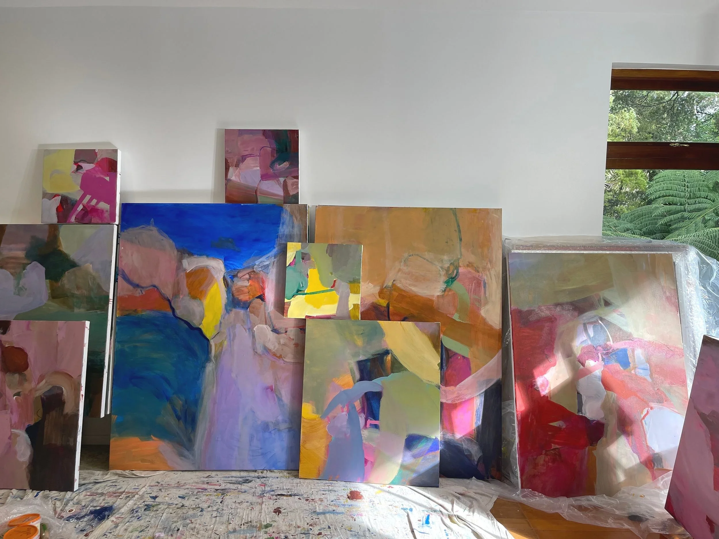 Helen creates colour-rich, layered paintings featuring soft, overlapping forms and plains, sweeping curves and painterly marks. Step inside Helen’s colour-filled home studio and see large scale artworks on canvas, to small studies on paper.